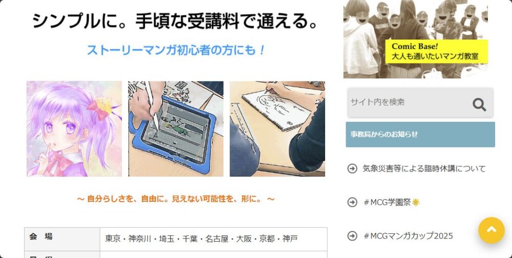 漫画カルチャー学園(MCG)ComicBaseマンガ教室は、小学4年生からシニアまで通えるマンガ・イラスト教室です。